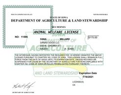 Dana's Dogs LLC is licensed by the state of Iowa through the Department of Agriculture for dog boarding, dog daycare, and dog training. This means I have passed on-site inspections of my facility in Salem and have the correct procedures in place to ensure the safety of the animals in my care.