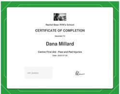 I have completed my certification through Rachel Bean RVN's School for Canine First Aid - Paw and Pad Injuries. This course covered basic paw injuries and how to treat them as well as when to contact your veterinarian.